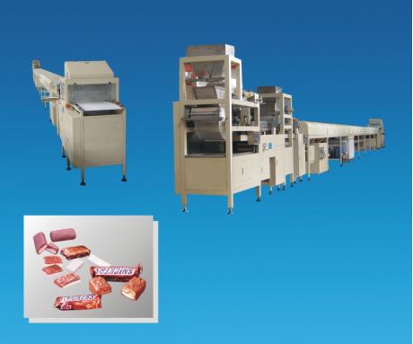 ●MB600型多功能糖排成型機組,由低溫冷液系統、成型輥壓裝置、果仁撒布裝置、冷卻成型系統、糖條輸送裝置、成品切段裝置等組成部分,可以生產諸如塊狀的單層、雙層規格的各式夾芯糖排產品的糖果類休閑食品。